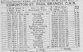 | The schedule, from the 1925 Waghorn Guide, tells us that four return trips per week connected St. Paul and Edmonton. The train took an astonishing 10 hours to traverse 200 kilometers! |