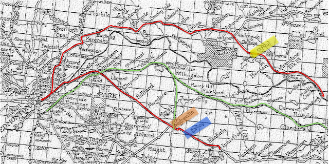 In the early decades of the 20th Century, even getting between Edmonton and St. Paul was a struggle. From St. Paul, one had to travel some 105 kilometers by horse and buggy to Vegreville, where one of the oldest railway lines in the province was situated, owned at the time by Canadian Northern Railways (CNoR). CNoR was started in 1895 in an attempt to compete with Canadian Pacific Railways (CPR) - the company started building track in Manitoba and thereafter spread its network East and West. By 1905, CNoR tracks had reached Edmonton through a southern route (see Figure 1), offering an alternative to the CP's route. In 1914, CNoR began construction of a more Northern route to Saskatchewan, but as the Alberta Heritage Community Foundation notes, the war effort stalled progress: